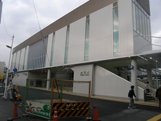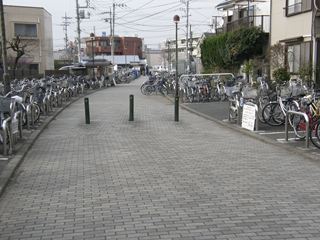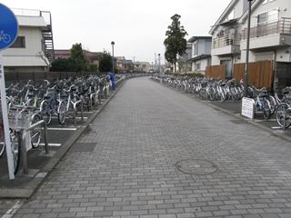 [武蔵田中駅 たちかわえき Tachikawa station] [南拝島駅 むさしうえのはらえき Musashi-Uenohara station] [拝島駅 ごうちえき Gochi station] 武蔵田中〜南拝島間の線路跡は新奥多摩街道という大きな道路に変わっていて、当時をしのぶことはできません。南拝島駅は新奥多摩街道沿いにある農協の脇の空き地が跡地ということで、そこから線路跡は再び小さな道になります。そして、この道路をひたすら行くと廃線跡は駐輪場に変わり、その駐輪場を進むと廃線跡は拝島駅の構内へと消えていきます。 |