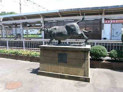 改札とホームへ続く跨線橋までは少し離れています。倶利伽羅峠の戦いにちなんだ火牛(気になる方は調べてみてください)の銅像が置いてあります。