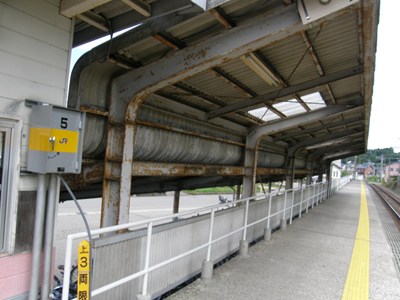 線路が微妙にカーブしているところにある1面1線の棒状駅です。このカーブによって津幡、中津幡、本津幡の3駅が津幡町市街地を取り囲む形になっています。