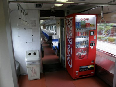 車端部のデッキには自販機が設置されており、つり革があることで立ち席としても利用できるようになっています。指定席だたため立ち入れませんでしたが、自販機がない方の車両ではこの部分にも座席があるようです(写真奥側)。
