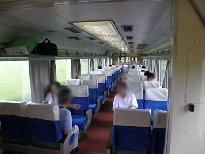 リクライニング機構付きの座席はバケット構造になっているため快適ですが、座席が低いため頭の部分を支えてくれないということと窓側にしかテーブルがついていないことがやや難点です。各座席の下には棒型のフットレストが付いており、この構造はニューレッドアローにも引き継がれています。