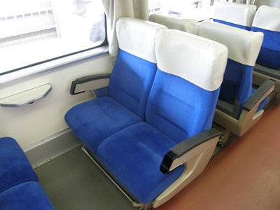 車内はレッドアローの頃のままで、回転式リクライニングシートが並んでいます。モケットの色が青いため、明るい印象の車内です。