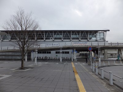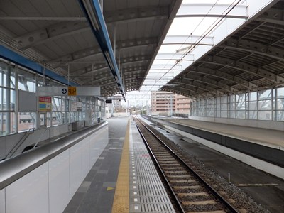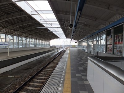 単式1面1線の高架駅で、ホームの反対側には複線化に備えて作られた使われていないホームと路盤があります。駅舎はGK設計という会社が設計していて、格好いいデザインです。