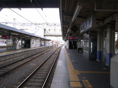 成田空港方は千葉線と本線が分岐しています。駅の東側で両線が立体交差するため、向かう方向とは逆方向に分かれます。
