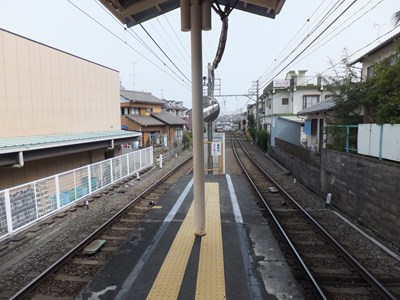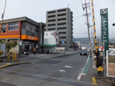 御門台駅の駅舎はホームに直結しており、駅前踏切の真ん中に位置している。