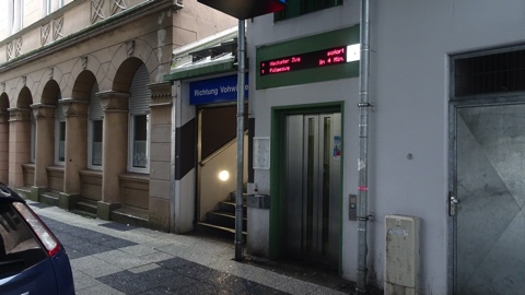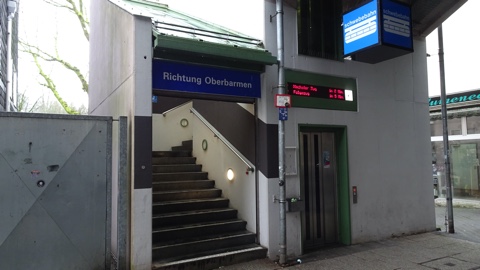 オーバーバーメン方面ホームへは通りの北側から出入りする。日本なら駅名が書かれていそうな部分に「Richtung Vohwinkel (/Oberbarmen)」と書かれている。