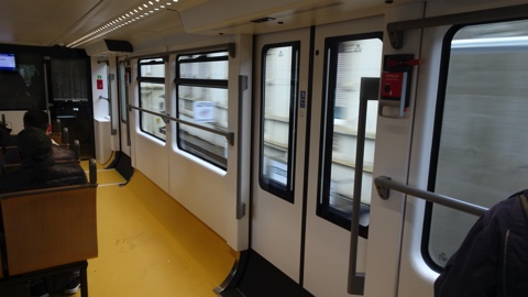 3号車の内装は1号車とほぼ変わらない。1号車の写真と見比べて分かる通り、床とモケットのアクセントカラーは編成によって異なる(他に緑色の編成もある)。