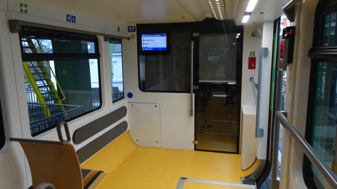 座席は木製のモダンなデザインで、座面と背もたれにはモケットが張られている。進行方向が固定なこともあり、鉄道というよりバスのような形状。