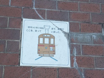 道路に都電が走っていたことを表すタイルが埋め込まれています。