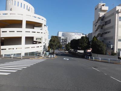 S字カーブを抜けると交差点があります。この交差点の先は区画整理されており、廃線跡がなくなっています。病院の敷地を横切るように廃線跡は伸びていました。