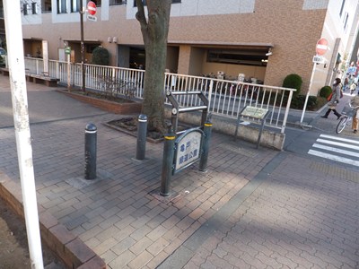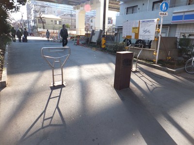 竪川人道橋の入り口には都電のビューゲルを模した柵が設置されています。