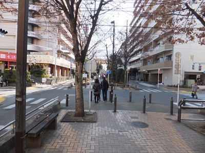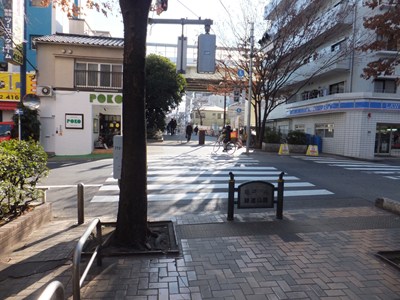 亀戸緑道公園は道路の両車線の間に挟まれた公園で、交差点では都電の雰囲気を感じられます。緑道唯一の交差点付近に竪川通停留所がありました。