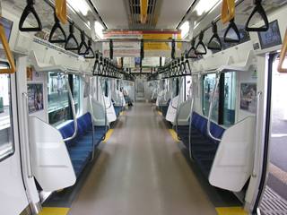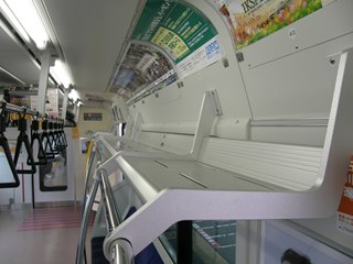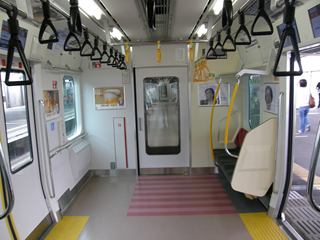 車内です。京葉線205系にも通じるところがある寒色系のモケットが採用されています。