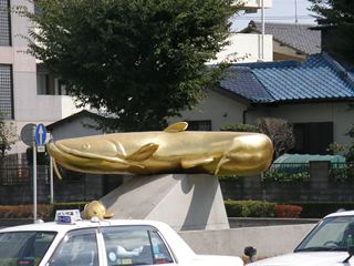 南口駅前 南口駅前もロータリーになっていて、金の鯰(なまず)の親子の像があります。