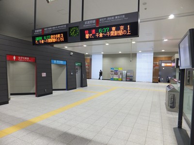 武蔵野線は輸送障害などが起きるとかなり長距離にわたって運休してしまうため、当駅は折り返しが可能な2面3線の線路配置とされました。駅舎は橋上構造で、白と黒のコントラストが際立つスタイリッシュなデザインです。
