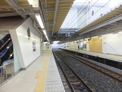 島式2面3線のJR型配線で、中線は非常時の折り返し用です。ホームは白を基調とした明るいデザインです。