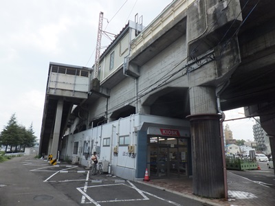 右側に見切れている道路が国道45号線で、キオスクの裏に駅出入口がある。1966年に高架化された古い高架駅であり、コンクリートにも年季を感じる。写