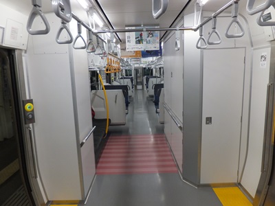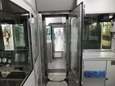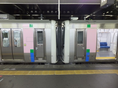 2編成を併結した際には幌がつながれ編成間を行き来できるようになる。客室が低床(950mm)のE721系では運転台の入り口に段差があるが、仙石線に