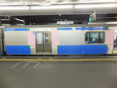 塗装はブロックパターンのラッピングで、仙石線の青が腰板部・幕板部に、沿線の桜を表す桜色がドア周りに配置され、その境界に東北線の緑が配置されてい