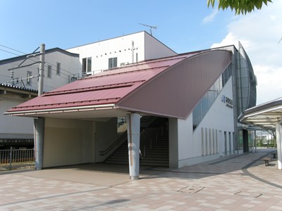 橋上駅舎で、駅の出入口は赤い屋根が特徴です。