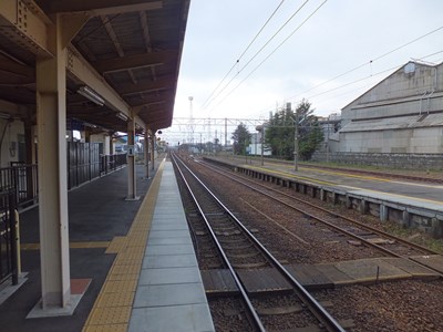 駅舎側が金沢方面のホーム、跨線橋を渡った先が富山方面のホームとして使用されています。中線は退避用です。