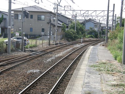 東口と線路の間にはスペースが開いています。かつてはここが北鉄能登線でした。廃線跡はサイクリングロード化されています。