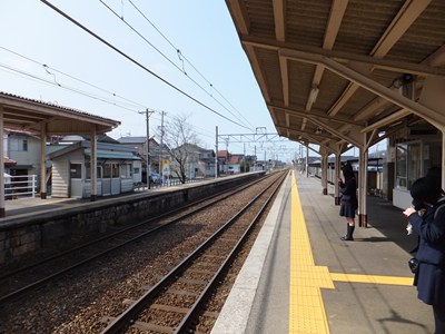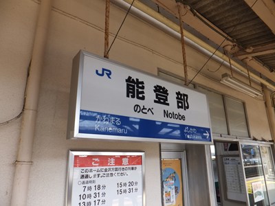 能登部駅は合併して中能登町になる前の鹿西町の中心部にある駅で、駅の周辺は商店などもある住宅地になっています。相対式2面2線の行き違い可能駅で、下りホームの側にはコンクリートの駅舎があります。