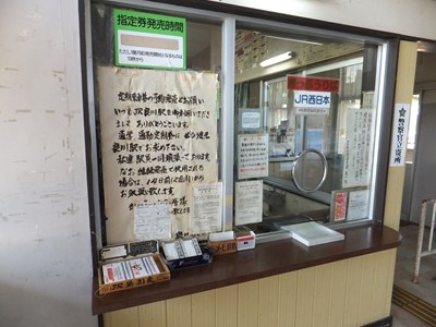 この駅は有人駅ですが、中能登町が委託を受けて窓口業務をしています。案内の紙が一枚一枚手書きで、とても達筆です。