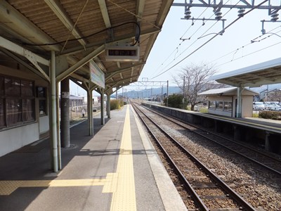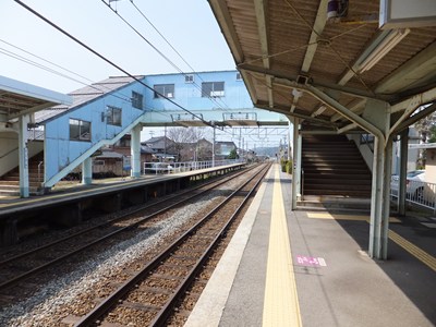 相対式2面2線の線路配置で、コンクリート造の駅舎は下りホーム側にあります。