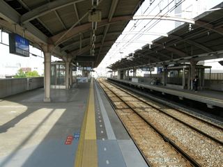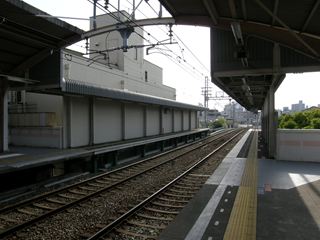 尼崎方より 相対式2面2線のホームですが、明らかに島式2面4線にできるようになっています。