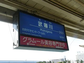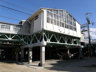 メインの東口は上下線で駅舎が分かれています。駅舎は出入口は堤防の道に面し、駅舎そのものは武庫川河川敷に浮かぶように建っているという特徴的な構造です。また、下り線側の駅舎には鉄橋と併設された歩道につながる出入口もあります。