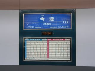 駅名標は時計などと一体化した一部の新しい駅で見られるデザインです。