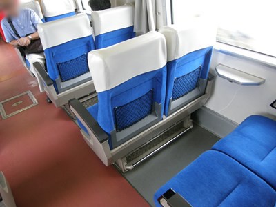 リクライニング機構付きの座席はバケット構造になっているため快適ですが、座席が低いため頭の部分を支えてくれないということと窓側にしかテーブルがついていないことがやや難点です。各座席の下には棒型のフットレストが付いており、この構造はニューレッドアローにも引き継がれています。