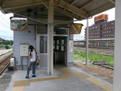 新魚津駅の入り口は魚津駅の東西自由通路の中にある。階段しかなく、バリアフリー化は難しそうだ。