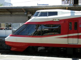 [ 1000系「ゆけむり」 ] 長野電鉄(長野線用) 小田急ロマンスカーといえば日本の民鉄特急を代表するといっても過言ではないほど有名な特急形電車ですが、2006年、そのうちの1つ、10000形HiSEが小田急電鉄から長野電鉄へとやってきました。車両形式は1000系となり車両の長さも元の11両から4両に減らされていますが、連接式の車体の構造や先頭車の展望席は変わっておらず、「ゆけむり」の愛称で現在は長野を代表する特急列車になっています。 外観・内装ともに小田急にいた時代とあまり変わっておらず、長野電鉄では全席自由席のため先頭の展望席にも100円の特急券で乗ることができます。2011年2月12日までは昼間のみのA特急に2編成両方が使用されていましたが、2100系「スノーモンキー」の導入により2月13日からは朝から夜までに運行される時間が増えた代わりに毎日1編成のみが使用されるようになりました。因みに、小田急電鉄に4編成いた10000系の中で長野にやってきたのは2編成のみで、残りの2編成は長野電鉄に2編成が譲渡されてからも小田急で活躍し続けました。(うち1編成はすでに廃車) |