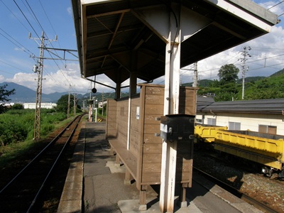 [ 桜沢駅 さくらさわえき ] 長野県中野市 桜沢駅は山の縁に位置している駅で、駅の入り口が山の側にあるため駅前には何もありません。 附属中学前駅にも似ている横長の大きな駅舎がある駅ですが、無人化されています。島式1面2線の行き違い可能駅で、保線用の貨車が留置されている側線があります。 |
