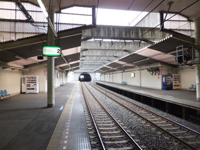 ホームの中央部は駅舎に覆われており、地下駅のような雰囲気が漂っている。