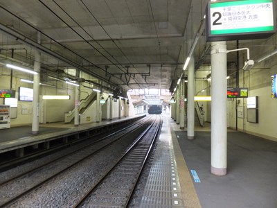 ホームは深い掘割の中にあり、掘割の地圧を支えるための梁が見える。また、駅舎からホームへ下りる階段付近の上屋の構造は特異である。