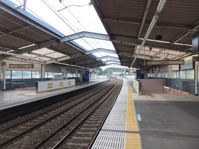 相対式2面2線の線路配置で、ホームは緩いカーブ上にある。
