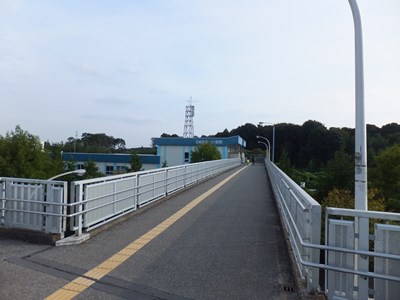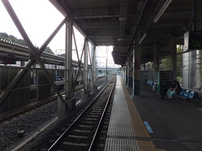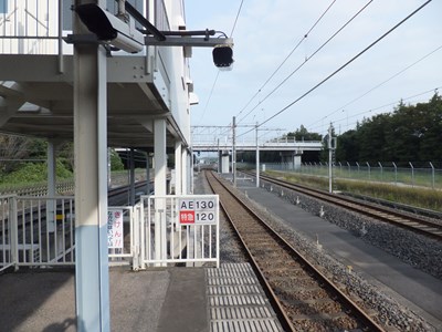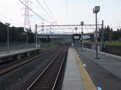駅東側の道路橋建設時にはホーム新設を想定していなかったのか、上り線と下り線の間に橋脚が挟まっている。
