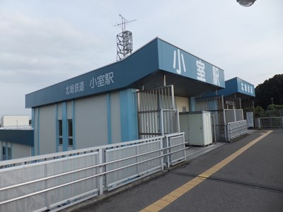 掘割区間にある他駅と違い小室駅は駅舎が地面よりも高いところにある。駅前にはロータリーがあり、駅前通りを左に進むとニュータウンの町並みが広がってい