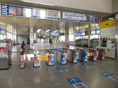 駅舎は他駅に比べて立派で、コンビニも入居している。改札内は窓が多く開放的な雰囲気である。