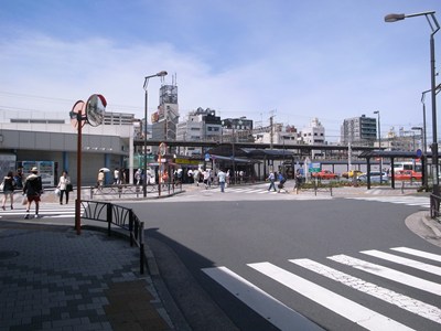 駅前の広場はJR金町駅の駅前広場です。奥にはJR金町駅があります。