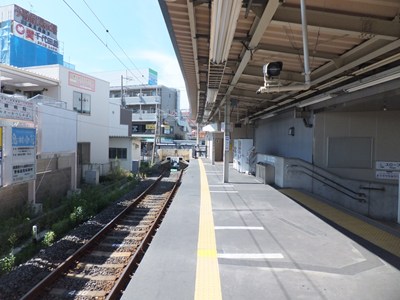 用地が狭いため、4両編成のホームながらもかなりギリギリに設置されています。ホームの幅は広めで、若干カーブしています。