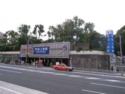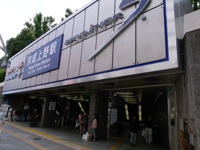 駅の正面口は駅の東側にあり、中央通りに面しています。駅のある付近では上野公園が大地になっており、その法面を駅出入口にしています。正面は成田空港への利便性をアピールする宣伝になっており、スカイアクセス開業の際に内容が変更されました。