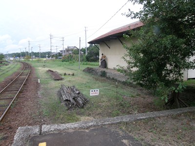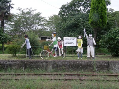 使われていないホームには案山子が展示されています。賑わい創出のためでしょうが、かえって不気味な気も…。