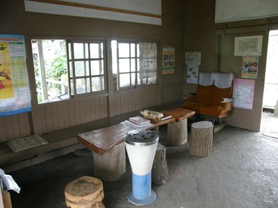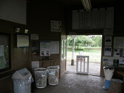 駅舎内の待合室には特急列車の座席と思われるものが置かれています。駅舎は後述の団体が使用しているためゴミ箱も設置され、それなりにきれいに整備されています。