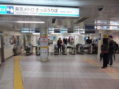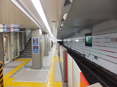 11番出入口の側のコンコースは10番出入口側とはつながっておらず、こちらはホームの下にあります(乗客は一旦余計に下った後ホームまで登る)。