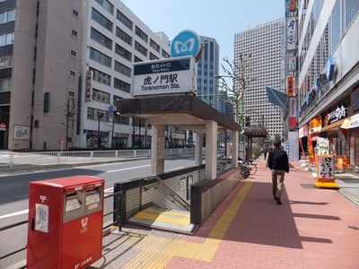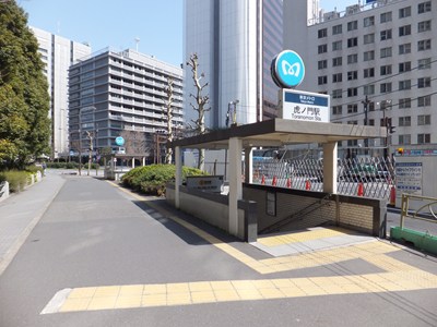 虎ノ門駅は銀座線の駅です。駅名は江戸城の南端付近にかつてあった門の名に由来しています。霞が関の官庁街の南に位置しているため文部科学省や財務省、日本郵政の本社が近くにあり、駅の出入口も銀座線単独の駅としては多めです。相対式2面2線の線路配置で、ホームは外堀通りの地下にあります。