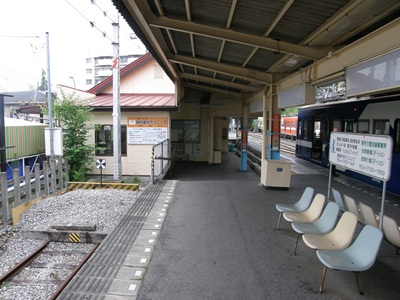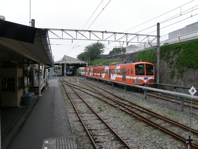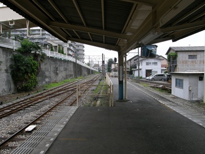 頭端式ホーム1面2線の線路配置で、駅舎はホームの付け根にあります。駅は切通しの中にあり、駅の裏手には車庫が広がっています。